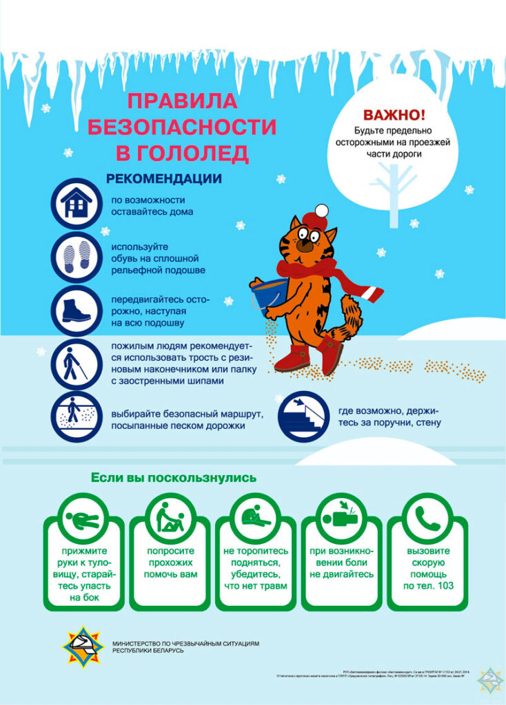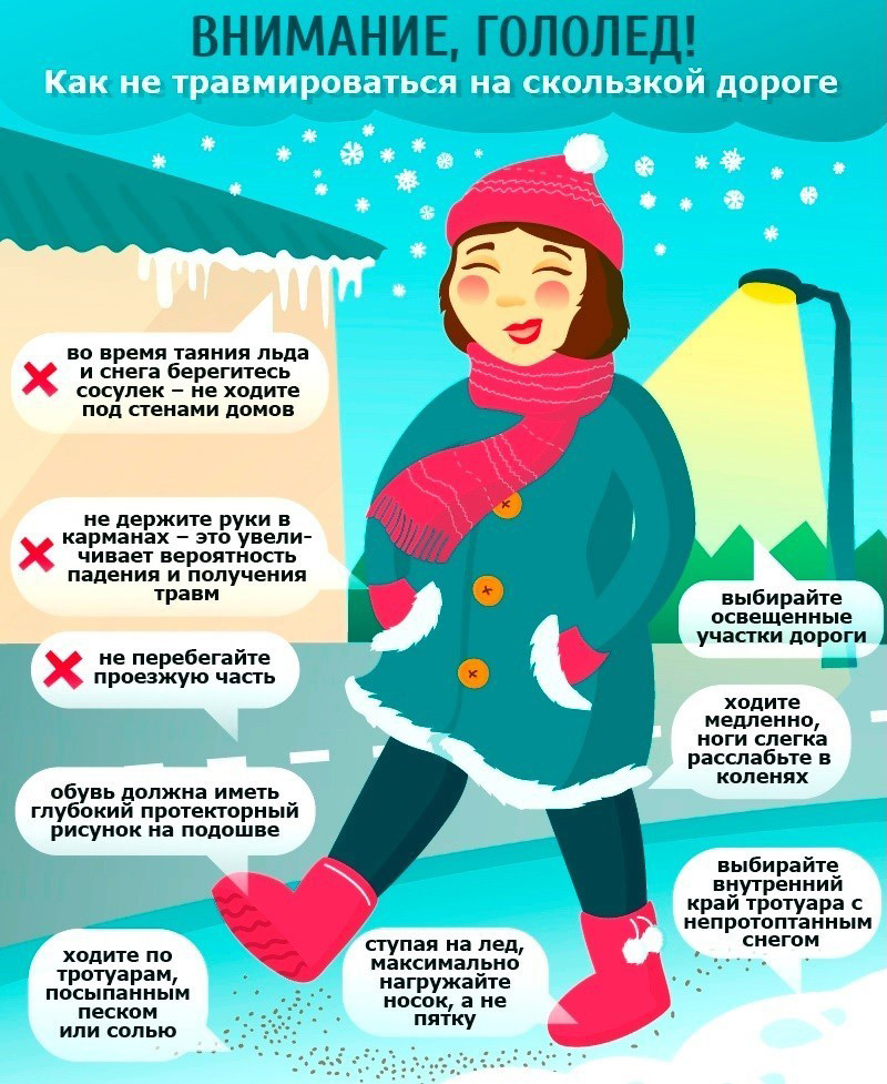 При ходьбе по льду и снегу старайтесь двигаться медленно, мелкими шажками, слегка согнув ноги в коленях. Лучше отказаться от длинных шагов и резких движений. Держитесь подальше от ледяных участков дороги, лучше пройти немного дальше, но сохранить равновесие.